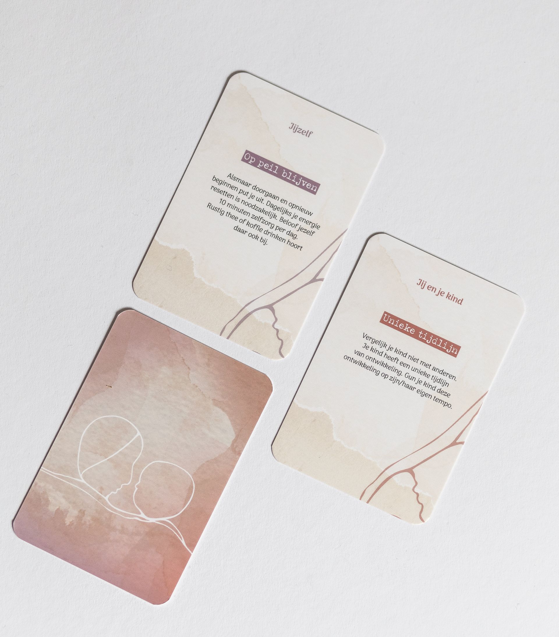 De kaarten helpen je om zicht te krijgen op wat er in je omgaat, zodat je sterker in je schoenen staat als ouder. Ze bieden je de mogelijkheid om dieper in jezelf te duiken en je eigen gevoelens en gedachten beter te begrijpen. Ze zijn ontworpen om je te ondersteunen in je reis als ouder van een zorgintensief kind.