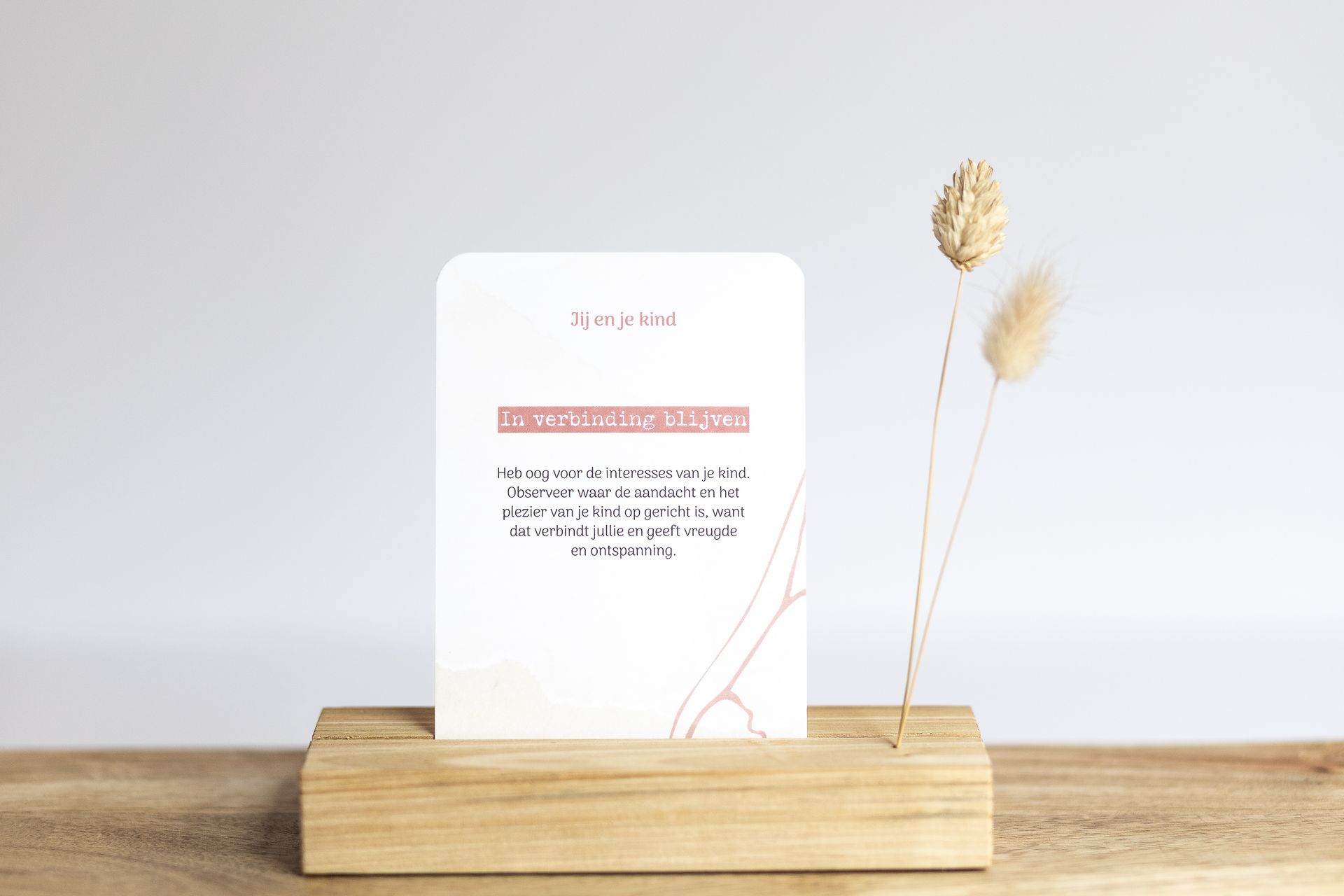 Krijg helderheid in de relatie met je kind en ontdek nieuwe manieren om samen te groeien. Met deze kaarten kun je de verbinding met je kind versterken. Ze helpen je om situaties meer inzichtelijk te krijgen en (samen) te reflecteren op jullie ervaringen.